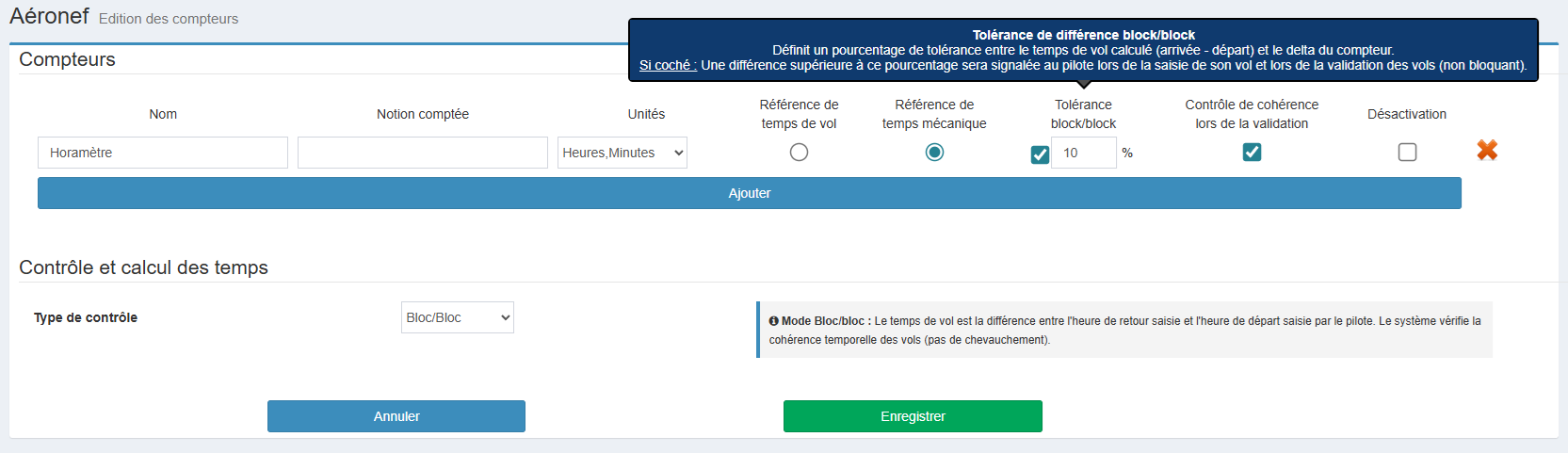 Chaque aéronef peut bénéficier d'un paramétrage combinant ces différents aspects : choix du mode de contrôle, configuration des abattements, gestion de plusieurs compteurs avec leurs rôles respectifs, et définition des tolérances pour chaque compteur. Cette flexibilité permet d'adapter précisément le comportement du logiciel aux spécificités de chaque appareil et aux pratiques de l'aéroclub.